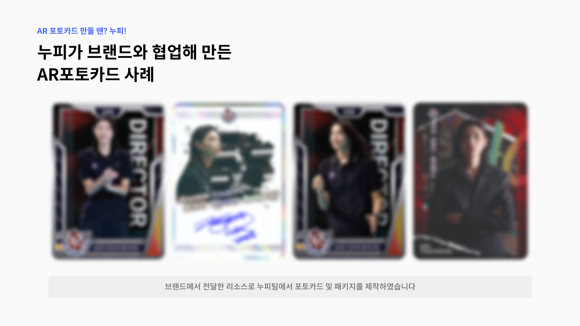 AR포토카드 제작이 처음이더라도 걱정마세요. 기획부터 제작까지, 누피 팀이 끝까지 도와 멋진 AR포토카드를 만드는 걸 돕습니다.